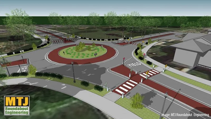 MTJ Roundabout Engineering designed this 126’ ICD compact roundabout in New Albany, OH. Geometric elements were designed to achieve capacity objectives, while maintaining essential design elements that promote safety for all modes (vehicular, pedestrian, and cyclists). Key to that safety is keeping speeds low.